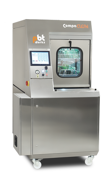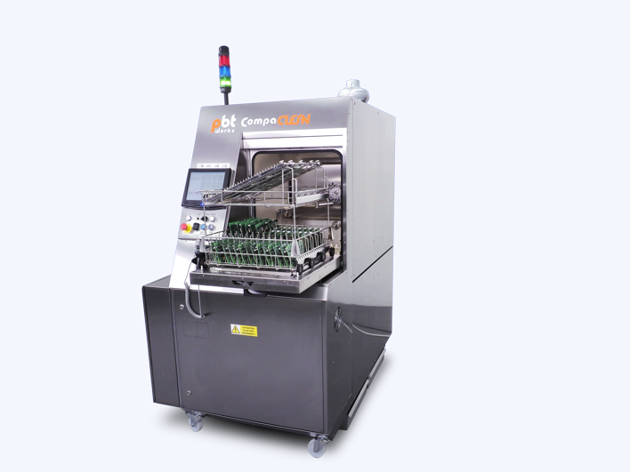 Čisticí zařízení od PBT Works určené pro nenáročné mytí většího počtu elektronických sestav od zbytků tavidel po pájení nebo pájecích palet z vlny. Umývané sestavy jsou v mycí komoře založeny v koši a tangenciálně ostřikovány z vrchní a spodní strany pomocí fixního rozvodu ostřikových ramen.