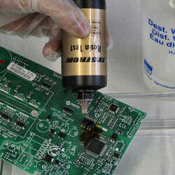 ® Resin Test umožňuje dočasnou vizuální indikaci tavidlových zbytků na bázi pryskyřice a jejich lokální distribuci na ploše DPS pomocí barevné hnědé reakce. Kritické zbytky pryskyřice, které snižují adhezi konformního krytí a způsobují jeho delaminaci, lze takto lokalizovat a ve výrobním procesu odstranit pomocí čištění.Tímto způsobem lze také kontrolovat jedno z kritérií normy J-STD 001 na max. přípustné množství pryskyřice na desce plošného spoje <40 μg/cm².