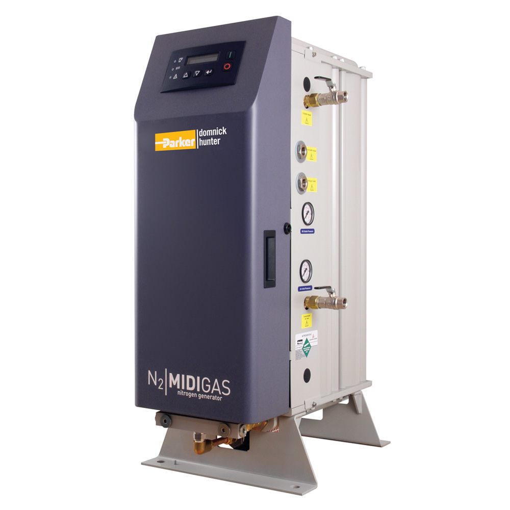 MIDIGAS nitrogen gas generators from Parker domnick hunter produce a totally on-demand nitrogen gas supply from a standard factory compressed air supply; a safe and reliable alternative to delivered gas options. The compact and lightweight modular design provides a consistent and easy to maintain solution for low to medium flow rate on-site gas requirements.