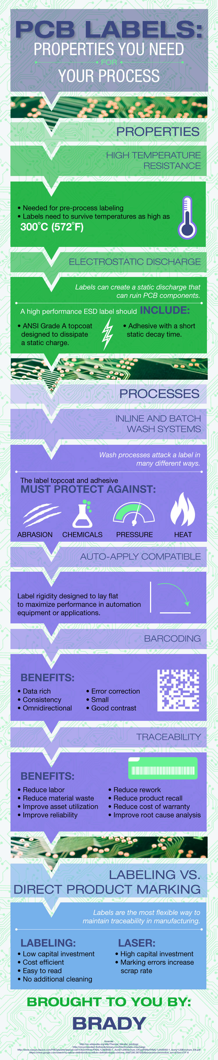 Brady's circuit board labels, or PCB labels, are polyimide labels that can withstand the high heats and powerful chemicals used in PCB manufacturing. Brady offers PCB labels in a variety of materials, including anti-static PCB labels and labels for auto-apply applications.