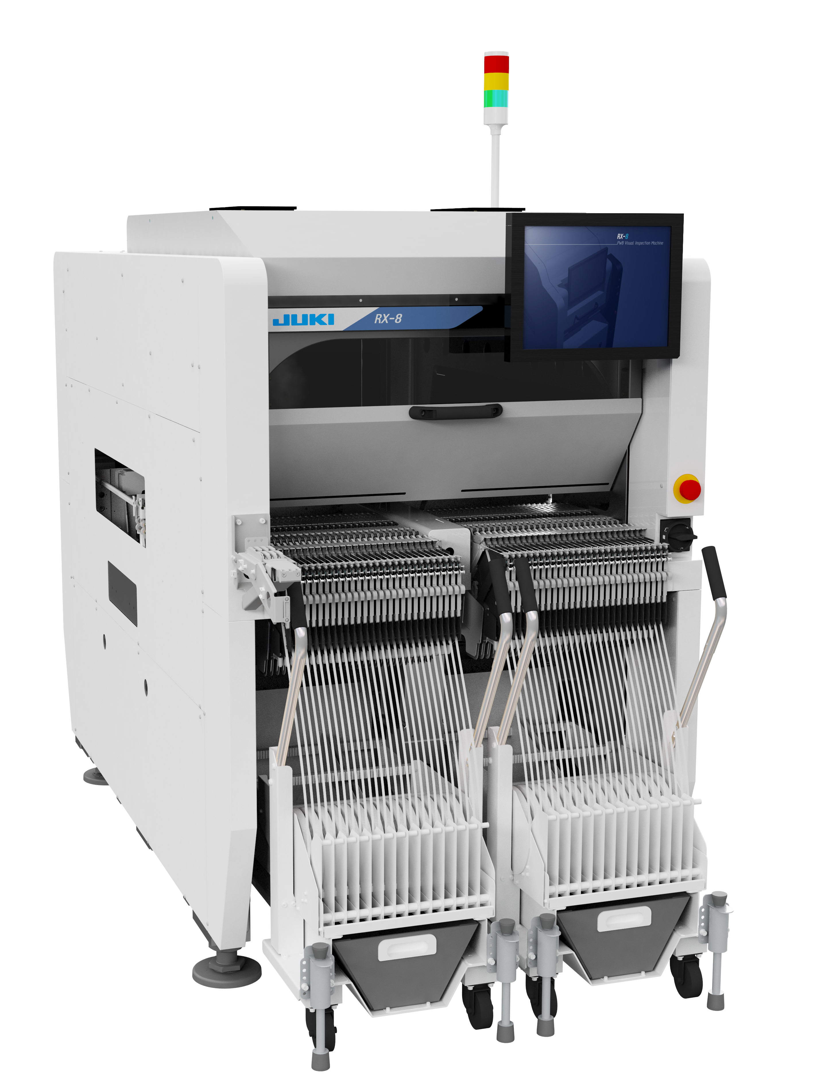 New P20 placement head achieves speeds of up to 100,000 CPH, JUKI's RX-8 provides exceptional productivity in a compact footprint at only 998mm wide.